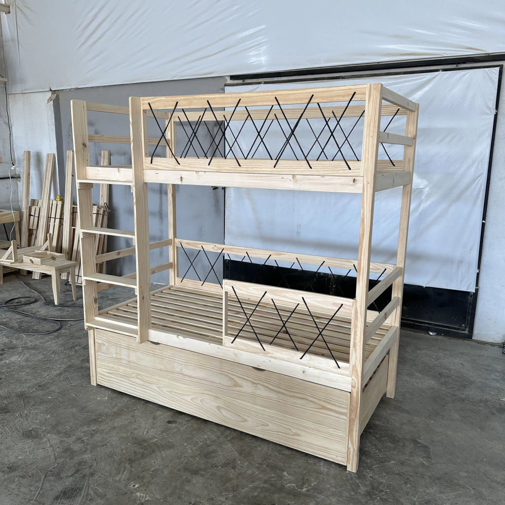 Beliche ou treliche? Bom, aqui você conta com uma terceira que fica embutida abaixo do beliche. Conta com rodinha para fácil locomoção. Conta com Design de corda e uma estrutura mega resistente. Feito para colchões de solteirão na medida de 1,88 x 0.88
